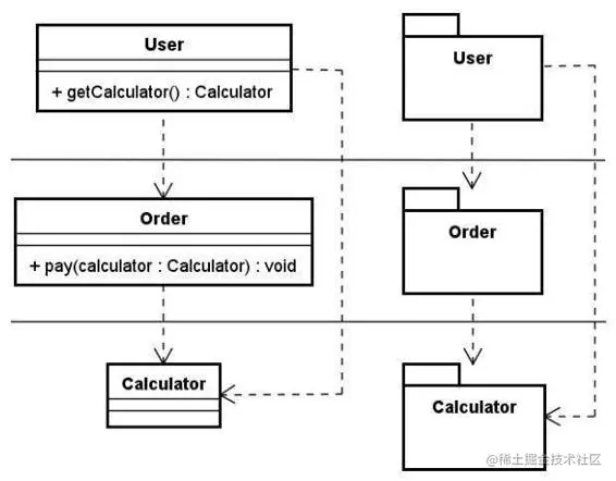 我们抽象出一个 Calculator 接口用于封装金额计算逻辑,该接口与Order处于同一层次,而User则实现了该接口,这样Order对User的依赖就转变成Order对Calculator接口的依赖,也就是把对User的直接依赖转变成了间接依赖。通过依赖注入机制,我们可以很容易地实现Order和User之间的有效交互。