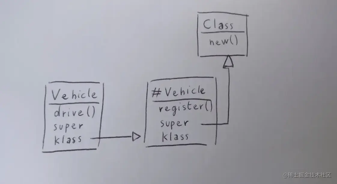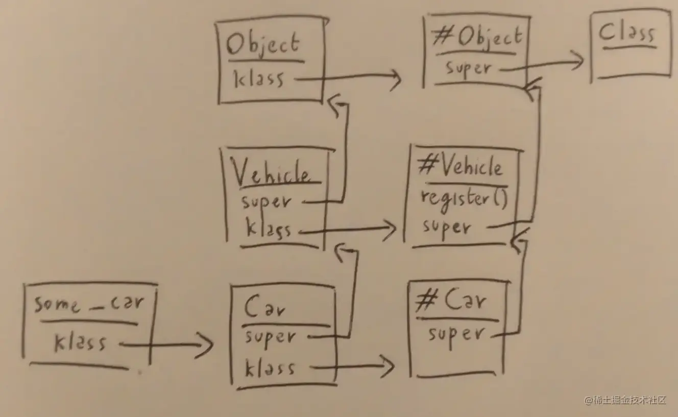 注意图中#Car的super指针是指向#Vehicle的,这种关系,让Car中的类方法register调用(super)父类中的类方法成为了可能。