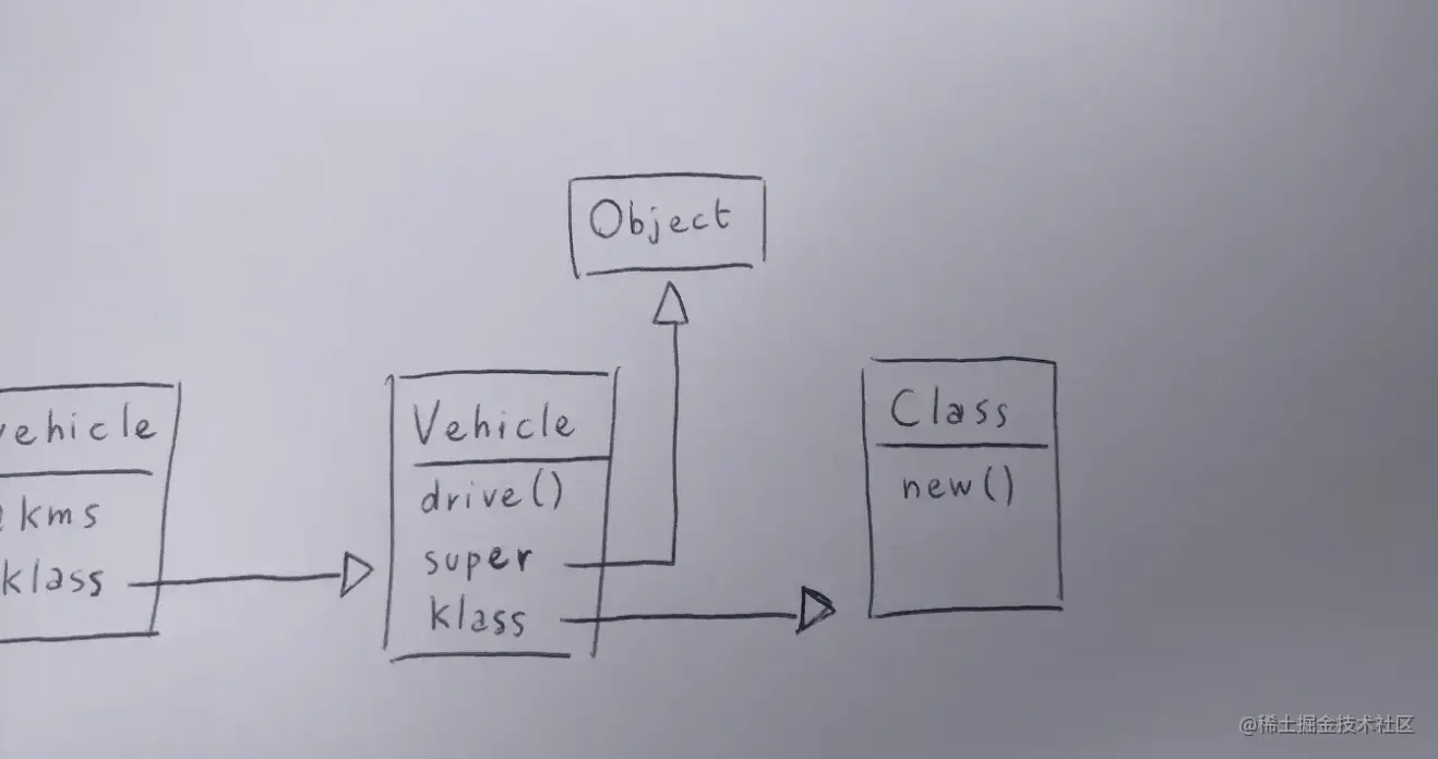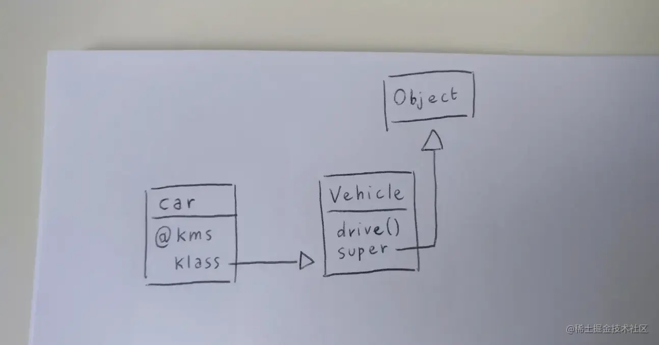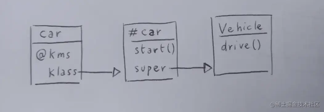 上述代码定义了Vehicle类,并创建了实例car,对car调用了方法drive。下图展示了内存中对Vehicle类和car实例的表示。
