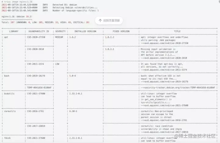 默认情况下, Trivy还会检测未修补/未修复的漏洞。这意味着即使您更新所有软件包,您也无法修复这些漏洞。如果您想忽略它们,请使用该--ignore-unfixed选项。