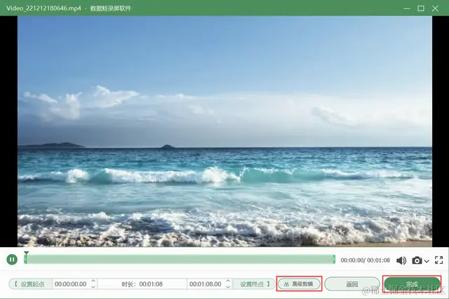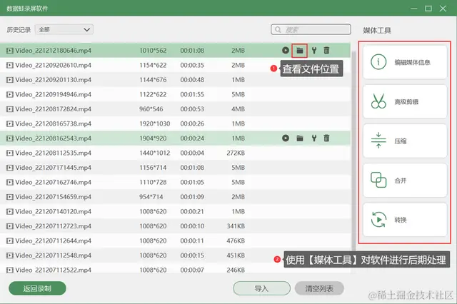 **步骤4:**录制完成之后,您可以在预览页面对视频进行简单剪辑或者点击【高级剪辑】按钮进行高级剪辑,然后点击【完成】按钮,进入【录制历史】页面,在此页面您可以通过点击文件右侧的【文件夹】图标,查看录屏文件位置,还可以使用【媒体工具】对文件进行压缩、合并、转换等后期处理。