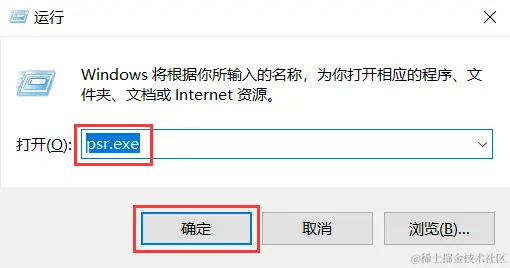 **步骤2:**在窗口的输入框中,输入“psr.exe”,然后点击【确定】按钮,进入【步骤记录器】页面。