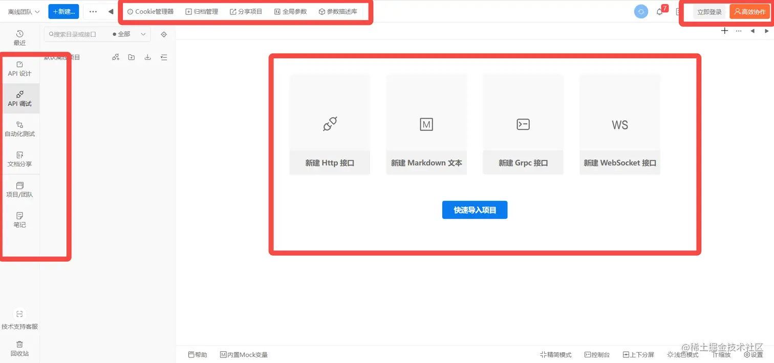 我们可以创建Http调试接口,可以写Markdown文档介绍,可以创建grpc接口调试,可以创建WebSocket接口。