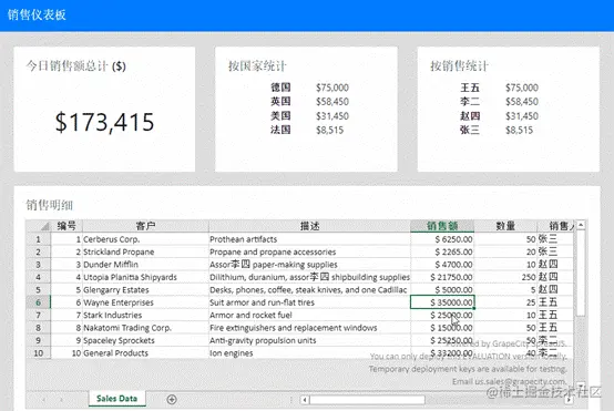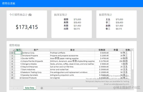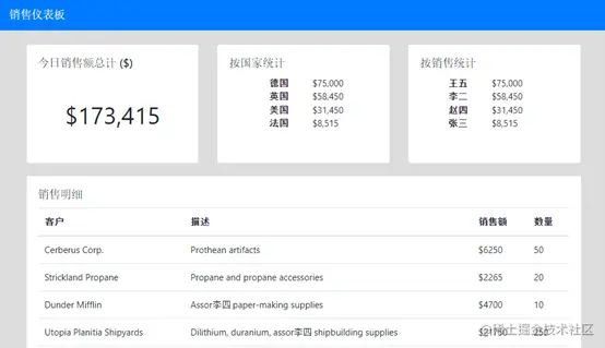 下面的截图是一个产品开发中非常常见的大屏展示界面示例。核心的数据源为一组销售数据,上方三个仪表板以及下方的表格组件共享同一个数据源,实现了数据明细显示以及各维度的数据统计。