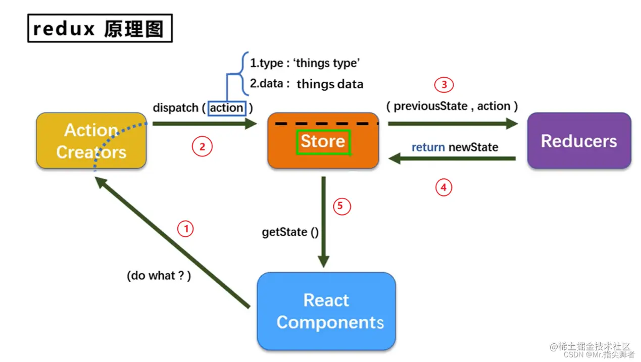Redux 原理图如下,可以看到store仓库是Redux的核心,通过维护一个store仓库管理 state。state 是只读的,唯一改变 state 的方法就是组件触发 Action。通过编写Reducers 函数,它会接收先前的 state 和 action,并返回新的 state。