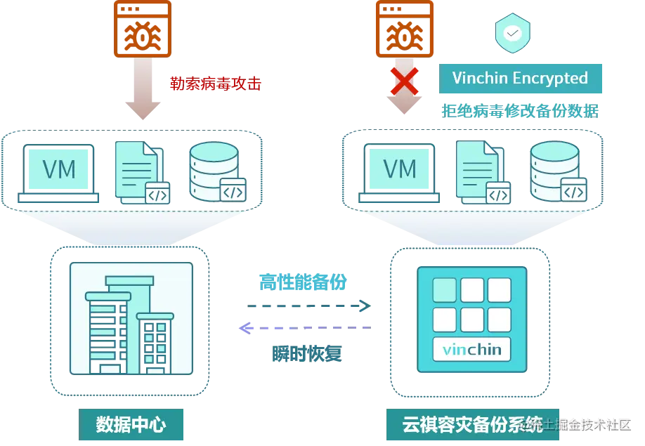 云祺特有的备份数据防篡改功能,能够有效应对勒索软件攻击,通过Vinchin Encrypted Backups技术,全周期全方位对备份数据进行监控和保护,当有勒索软件或恶意软件尝试修改备份数据时,将被直接拒绝访问,用户数据安全有保障。