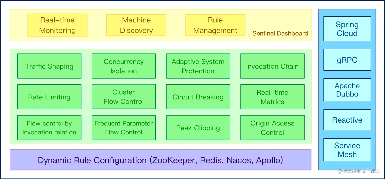 Sentinel提供了丰富的功能特性,如流量控制、异常熔断、集群限流和速率控制等。此外,Sentinel也提供了丰富的数据采集如RPC、HTTP以及API Gateway等。