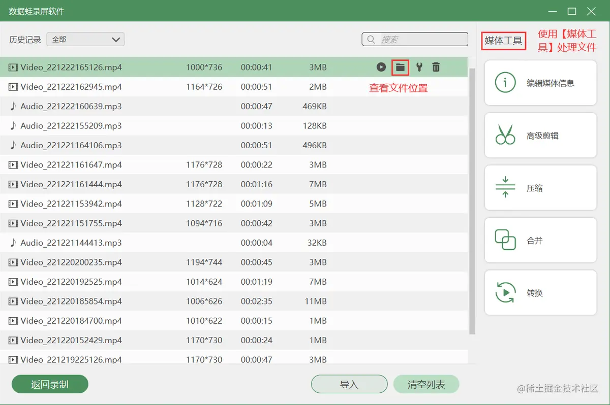 **第5步.**点击【完成】按钮后,进入【录制历史】页面,在此页面您可以看到以往的录音或者录屏文件,点击文件右侧的【文件夹】图标可以查看文件夹位置,还可以使用右侧的【媒体工具】对文件进行压缩、合并、转换等后期处理功能。