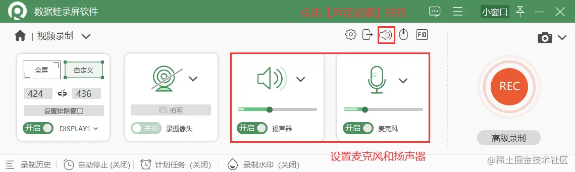 **第3步.**点击软件主界面的【视频录制】来到【视频录制】页面。如果您想要录制内部声音时,以开启扬声器;想要录入外部声音,可以开启麦克风。点击页面右上角的【声音设置】,还可以对麦克风进行增强和降噪处理。接着选择全屏或者自定义区域录制视频,接着点击【REC】按钮进行录制。