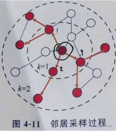2017 年提出的 Graph Sage 算法,基于GCN 邻居聚合的思想,但并不是把全部邻居聚合在内,而是聚合部分邻居,随机采样邻居K跳的节点。全邻居采样中给出了节点的抽取1跳和2跳的形式,而GraphSage只用抽取固定个数的近邻。如下图所示: