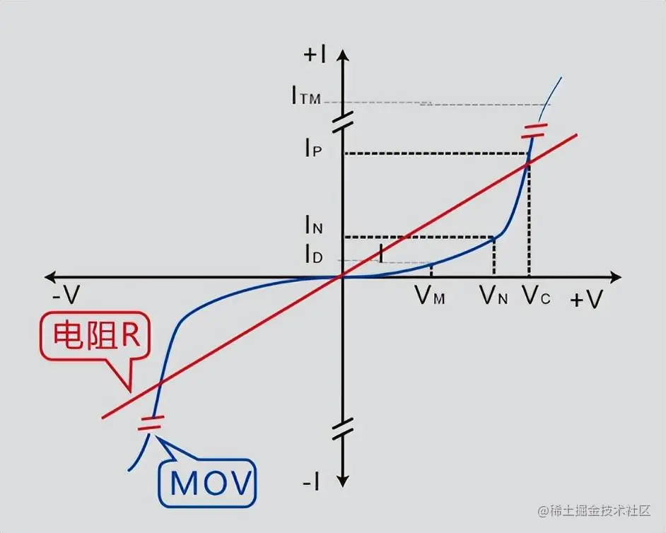 Vn 在规定持续时间和脉冲峰值电流(IN )下测得的 MOV 两端的电压峰值,In 通常1mA/DC。
