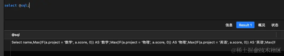 3、使用SQL语句:select @sql; 查询生成的行转列sql