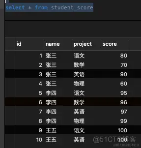 insert into `student_score`(`id`,`name`,`project`,`score`) values