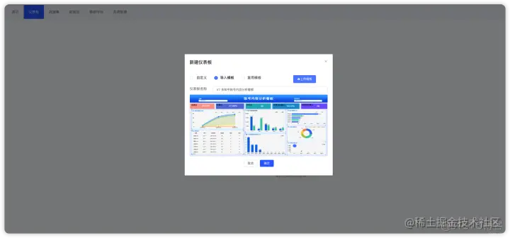 (1)通过导入模板的方式创建仪表板,仪表板创建成功后,逐个编辑仪表板中的视图,修改视图的数据集即可(点击此处下载模板)。