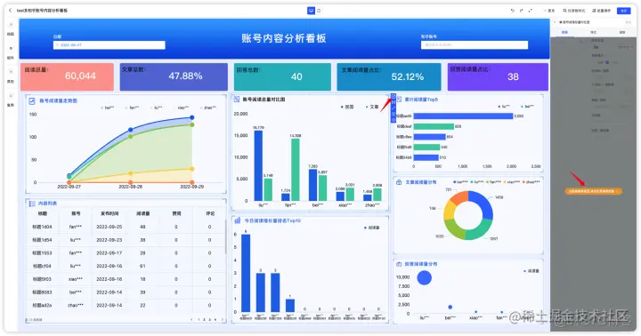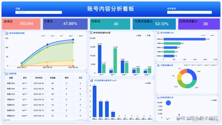 完成上面的步骤之后,一个简单的数据分析看板就制作完成了,我们得到了一个完整的“多知乎账号内容分析看板”,通过此仪表板你可以直观的看到所有账号的文章阅读量占比、回答阅读量占比,账号所有的内容列表,各个账号的阅读量走势,账号的阅读量排名情况,以及阅读量最高的文章有哪些等等。