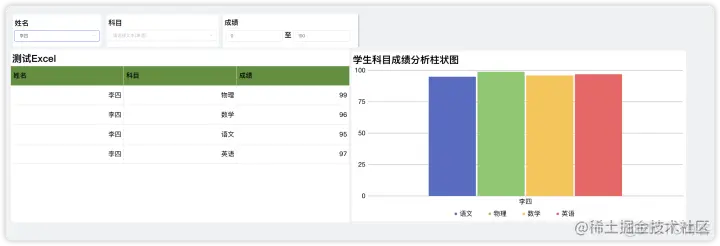 DataEase不仅让我轻而易举的对数据进行过滤查询,还能让数据变得更加直观,下面是我添加了一个分组柱状图后,对某一个学生姓名进行过滤后的结果,看起来相当清晰直观,而且操作简单,学习成本低。