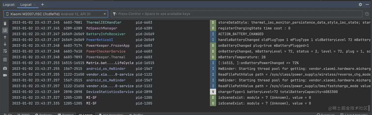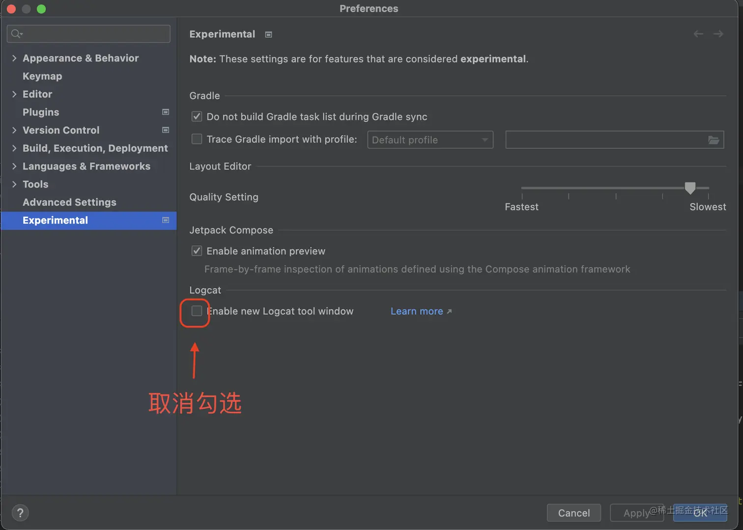 Android Studio 还原旧版Logcat 呱唧丶 2023-01-12 1,557 阅读1分钟 在Android Studio的日常使用中,我们有时会不小心设置到新版的Logcat,那么需要如何还原呢? 打开Android Studio的软件设置,在Experimental选项中将“Enable new Logcat tool window”取消勾选,之后点击右下角的OK,Restart重启Android Studio即可。