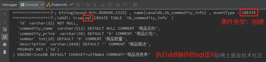 最后我们开始测试,首先启动MySQL、Canal Server,还有刚刚写的Spring Boot项目。然后创建表: