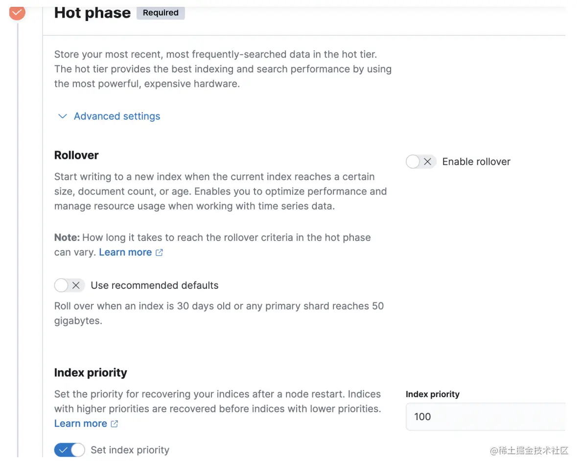 冷数据的切换,可以在kibana的index_lifecycle_management管理页面设置。针对上面的syslog场景,hot部分设置如下图,其余基本默认的就可以了。