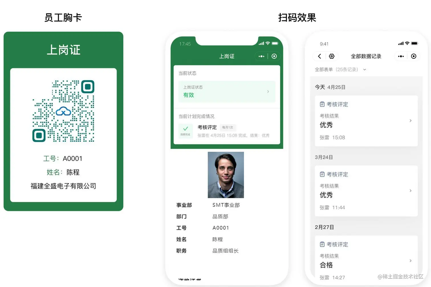 为员工生成一人一码,印制在卡证上,二维码中可存储完整的员工档案: