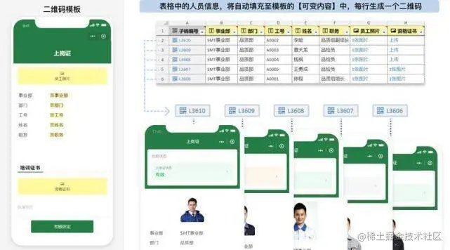 所有人员信息的二维码格式是相同的,但每个人员的具体信息不同。草料提供模板,可以为相同格式的人员信息卡创建一个批量模板,后续将人员台账内的具体信息通过表格填充至模板,就可生成一人一码。