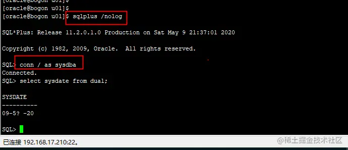 当提示Connected to an idel instance 连接失败时,说明数据库还未启动,利用startup命令启动数据库。数据库启动成功,可以执行简单SQL语句验证数据库,比如