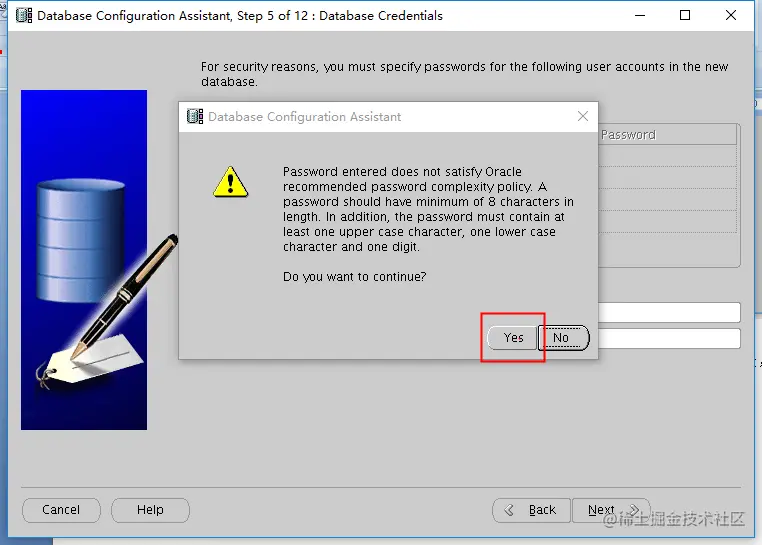 如果口令设置的太简单,不满足Oracle口令的复杂性要求,会弹出上面的界面,可以选择是,或者选择否,然后返