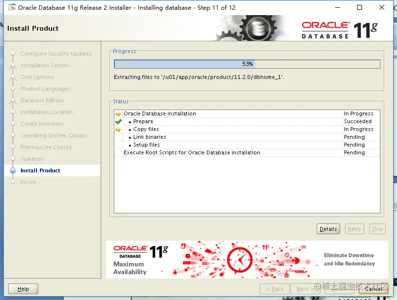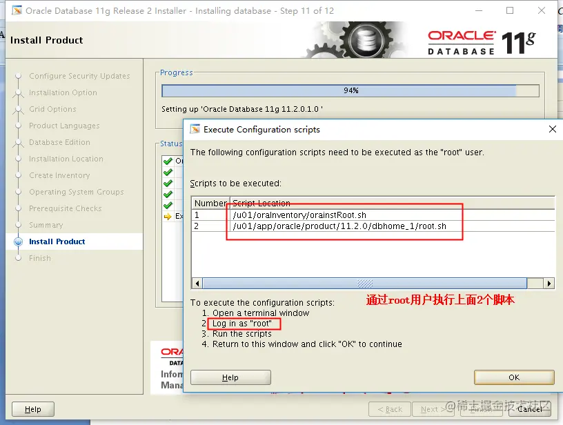 安装到94%进度的时候,需要按提示,用root用户去执行对应的脚本
