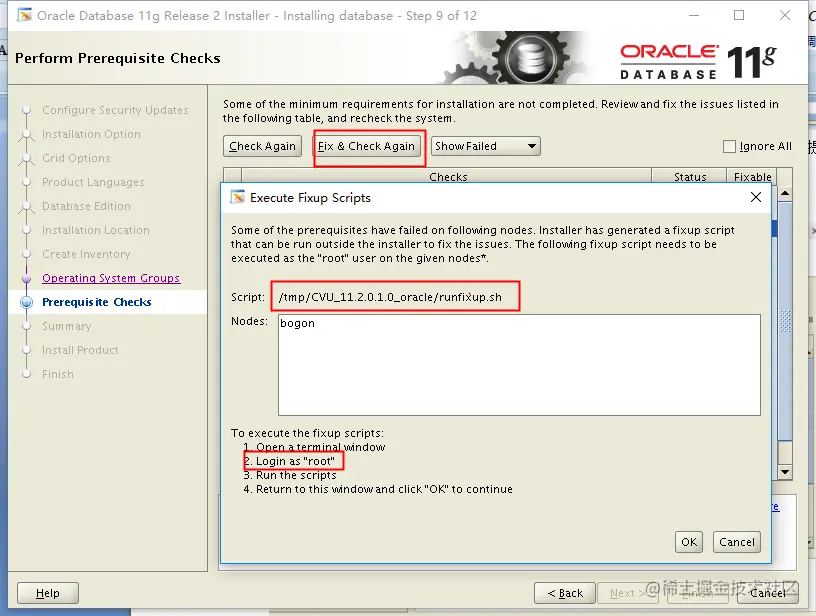 点击Fix &CheckAgain根据提示执行用root用户执行相关脚本