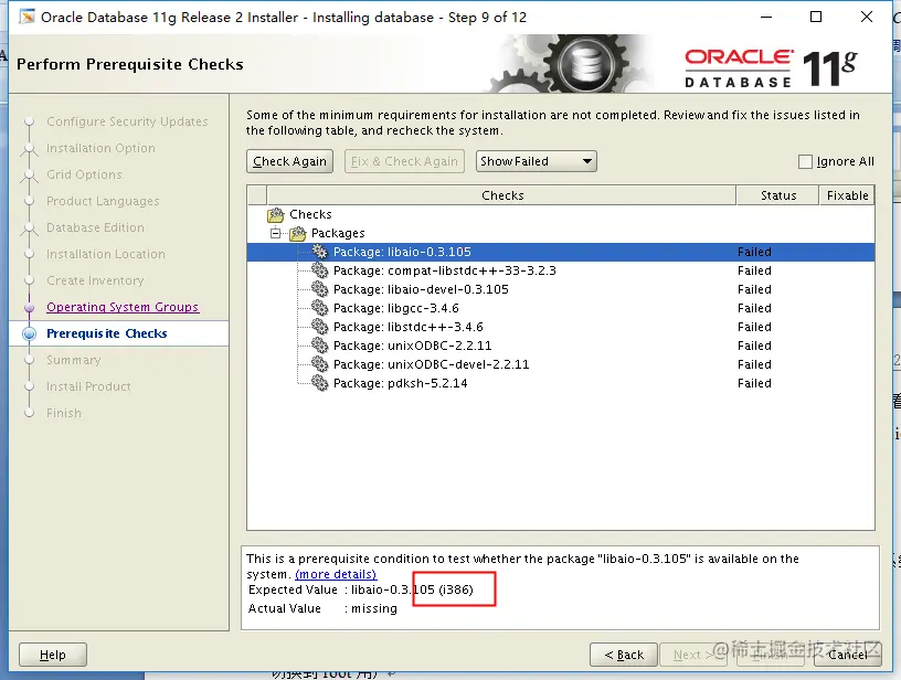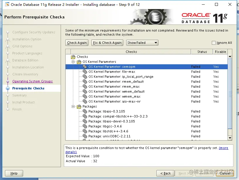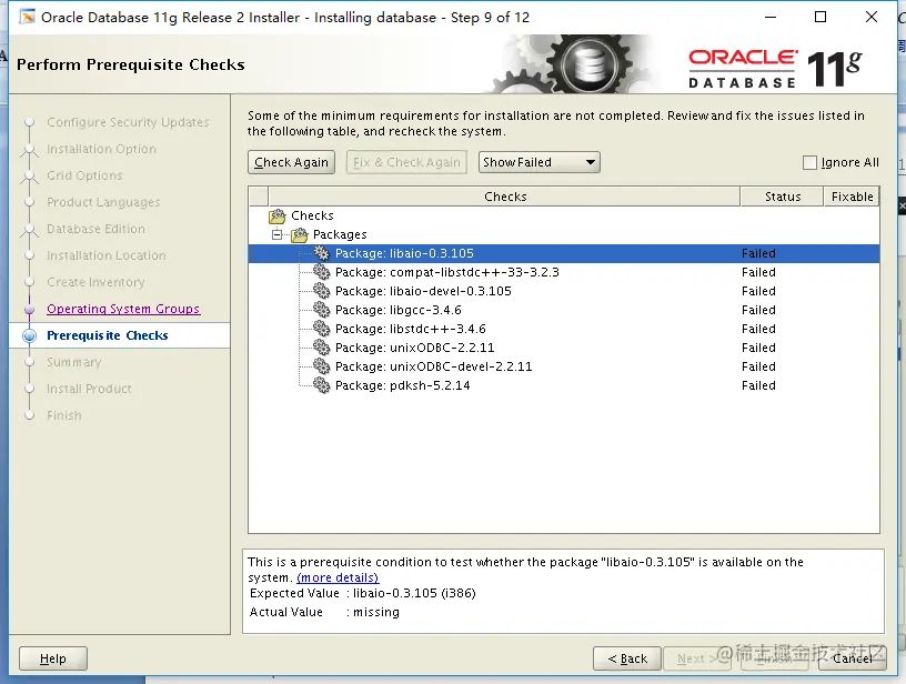 进入到验证界面,安装oracle数据库的满足条件,上图中存在的Failed项,我们需要解决上述failed后,才可以进行下步操作。