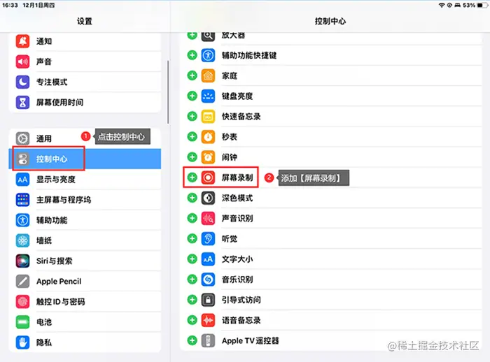 (注:如果小伙伴是第一次使用苹果iPad录屏功能,或者是在下拉页的菜单栏没有找到屏幕录制功能,就需要进行该步骤,否则可以直接跳过。)