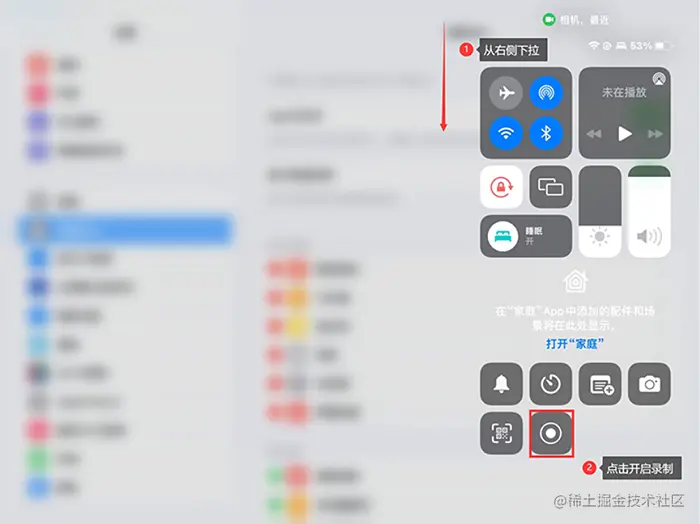 **步骤2:**从苹果iPad的屏幕右侧下拉,在下拉页的控制中心中,找到下方的【屏幕录制】功能,点击就可以进行录制了。