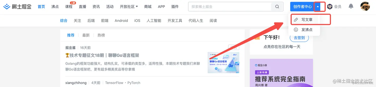- 在掘金技术社区( juejin.cn )平台产出符合标准的技术笔记,发布文章入口如图: