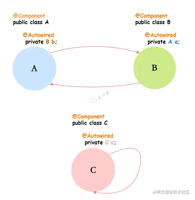 当 A、B 两个类发生循环依赖时: