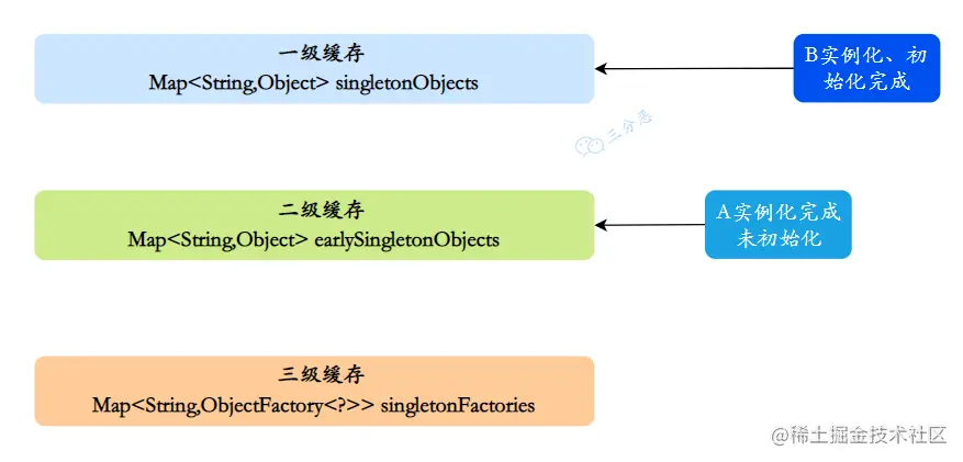 同样,B注⼊属性时发现依赖A,它就会从缓存里找A对象。依次从⼀级到三级缓存查询A,从三级缓存通过对象⼯⼚拿到A,发现A虽然不太完善,但是存在,把A放⼊⼆级缓存,同时删除三级缓存中的A,此时,B已经实例化并且初始化完成,把B放入⼀级缓存。