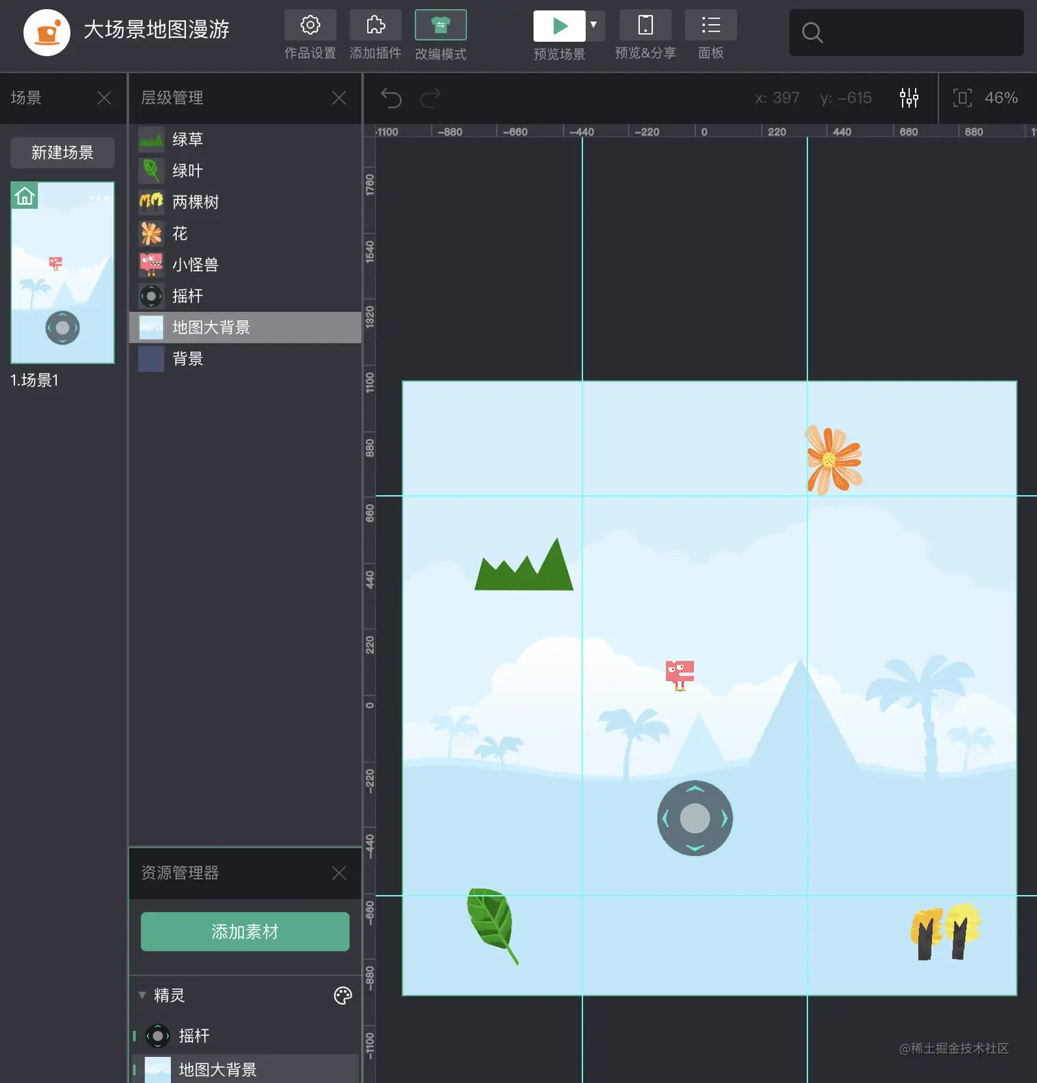 如图,我布置了一个这样的场景,里面有一张大的背景图(这个就是我们漫游的大地图啦),一个用于控制到处走动的小怪物,一些花花草草用于当作大地图中的参照物,还有一个摇杆,用于控制小怪物的移动。