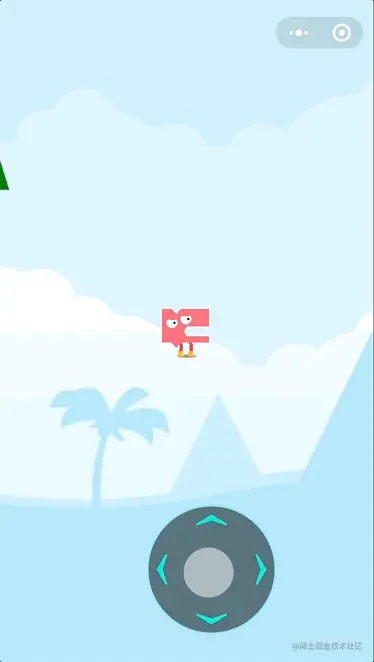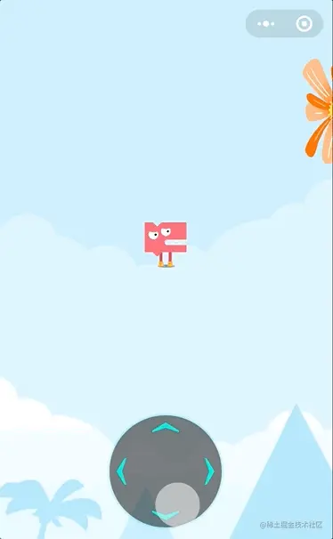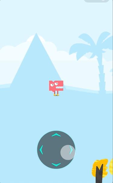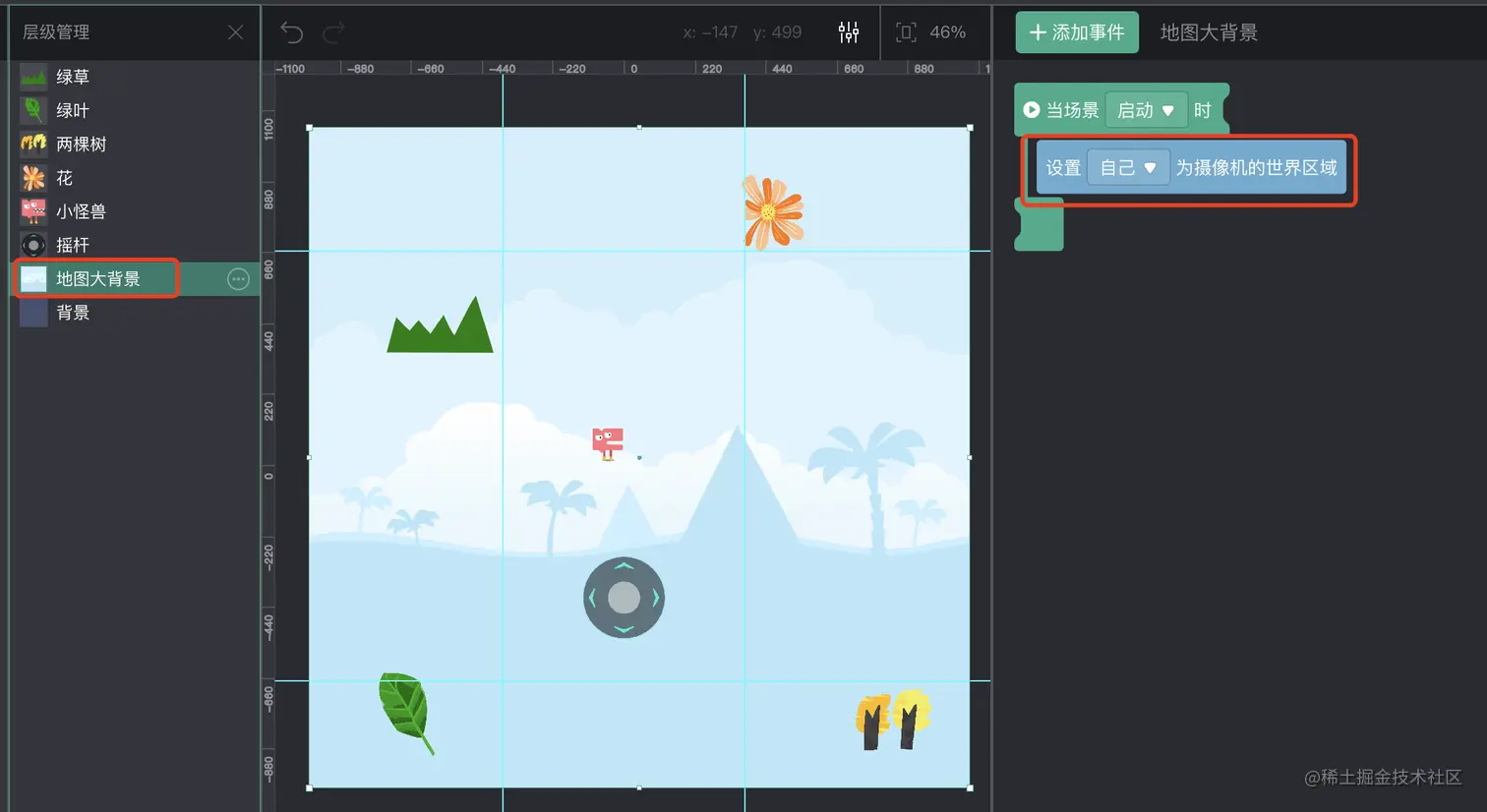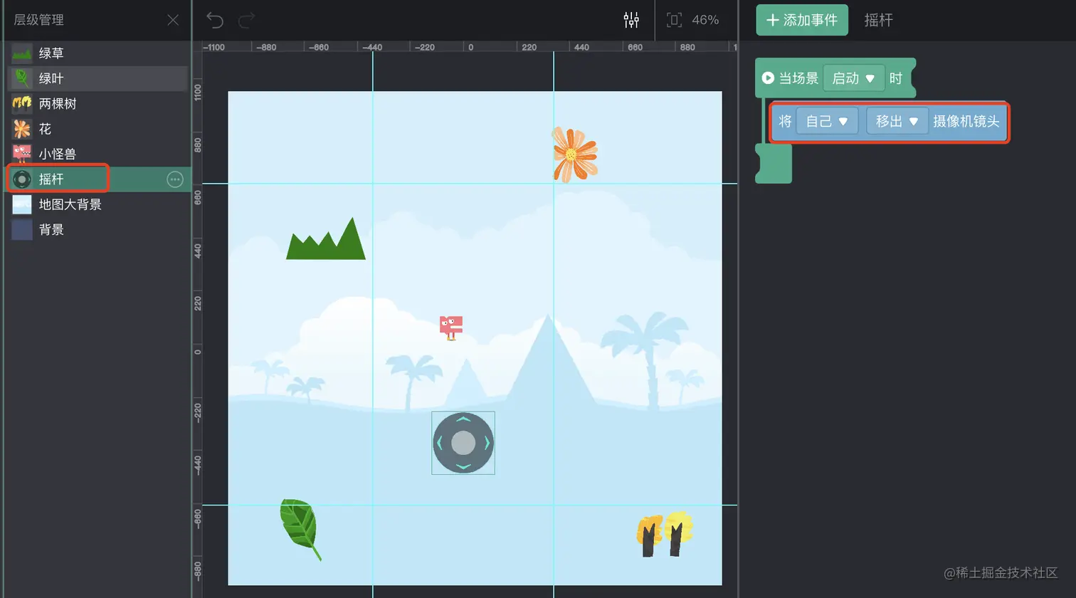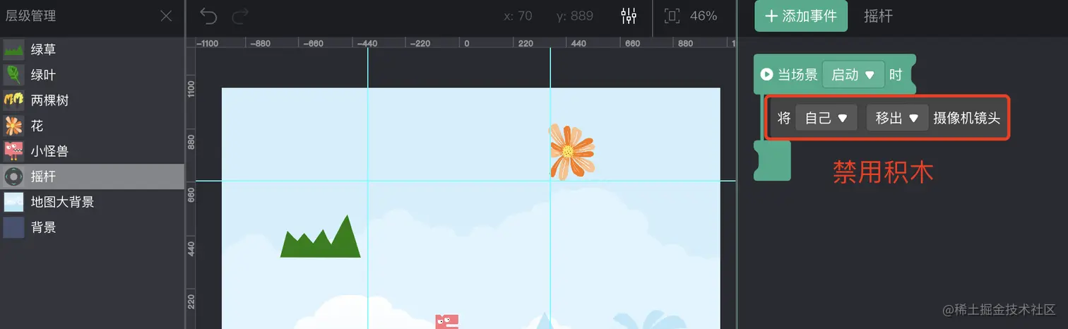 如图,我们为摇杆增加了这个积木后,摇杆就能够始终位于屏幕的固定位置。如果不使用这个积木,则摇杆会被视为整个游戏世界中的一部分,就如同示例中的花,树叶,和小树一样。此时,相机跟随着角色移动时,摇杆会被移出屏幕。