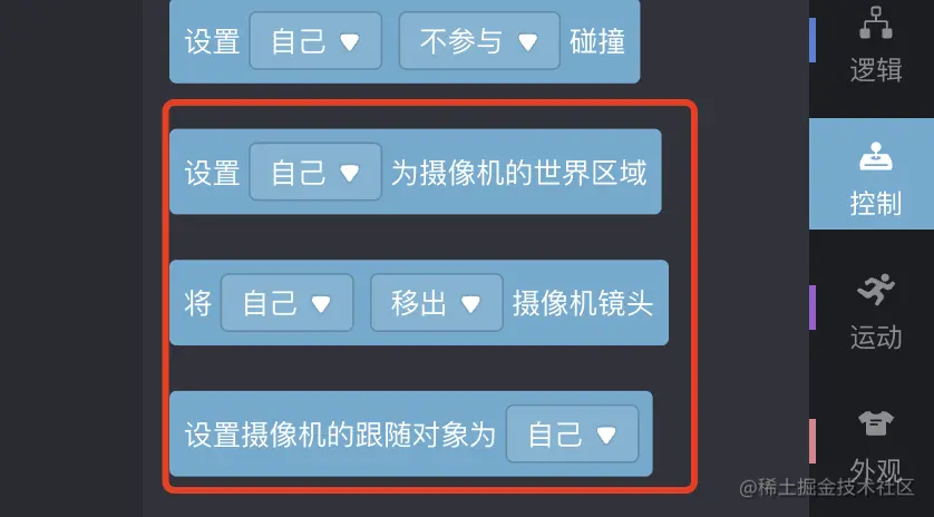 想实现这个功能,最重要的是理解微信小游戏制作工具中的三个与相机有关的积木块的使用。