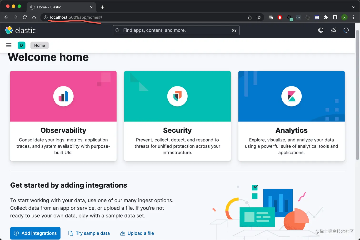 如果加上 -d 选项的话,Elasticsearch 会以 daemon 的形式来运行。上面是一种最为简单的方式来启动 Elasticsearch 集群及 Kibana。由于它没有设置安全,我们无需输入任何凭证就可以直接进入到 Kibana 了。