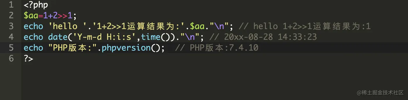 <?php$aa=1+2>>1;echo 'hello '.'1+2>>1运算结果为:'.$aa."\n"; // hello 1+2>>1运算结果为:1echo date('Y-m-d H:i:s',time())."\n"; // 20xx-08-28 14:33:23echo "PHP版本:".phpversion(); // PHP版本:7.4.10?>