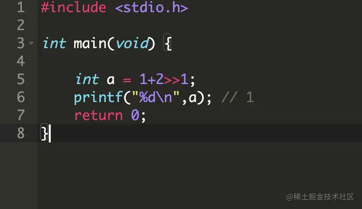 #include <stdio.h>int main(void) { int a = 1+2>>1; printf("%d\n",a); // 1 return 0;}