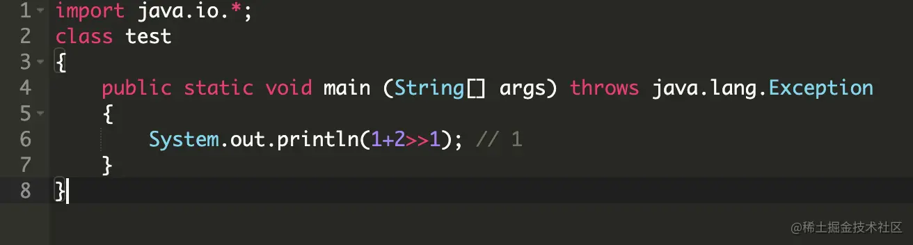 import java.io.*;class test { public static void main (String[] args) throws java.lang.Exception { System.out.println(1+2>>1); // 1 }}