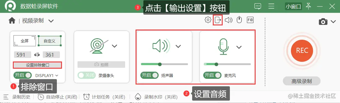 **步骤3.**进行视频录制。点击软件主界面的【视频录制】,来到【视频录制】页面。在此页面,**1)**您可以点击左下角的【设置排除窗口】排除不想录制的页面;**2)**通过点击右上角的【输出设置】按钮,您可以在【设置】页面修改视频的【输出质量】,选择“无损质量”可以让录屏的画质更清楚,您还可以根据需要修改格式、帧率等其他的参数;**3)**接着设置录制的范围,然后点击【REC】按钮开始录制。