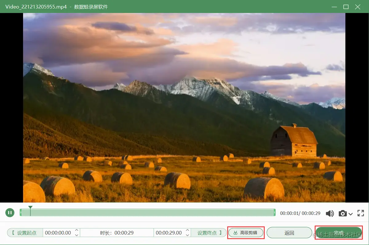 **步骤4.**预览录屏。视频录制完成后,您可以在预览页面对录屏文件继续简单剪辑,或者点击【高级剪辑】进一步剪辑视频,然后点击【完成】按钮,进入【录制历史】页面。