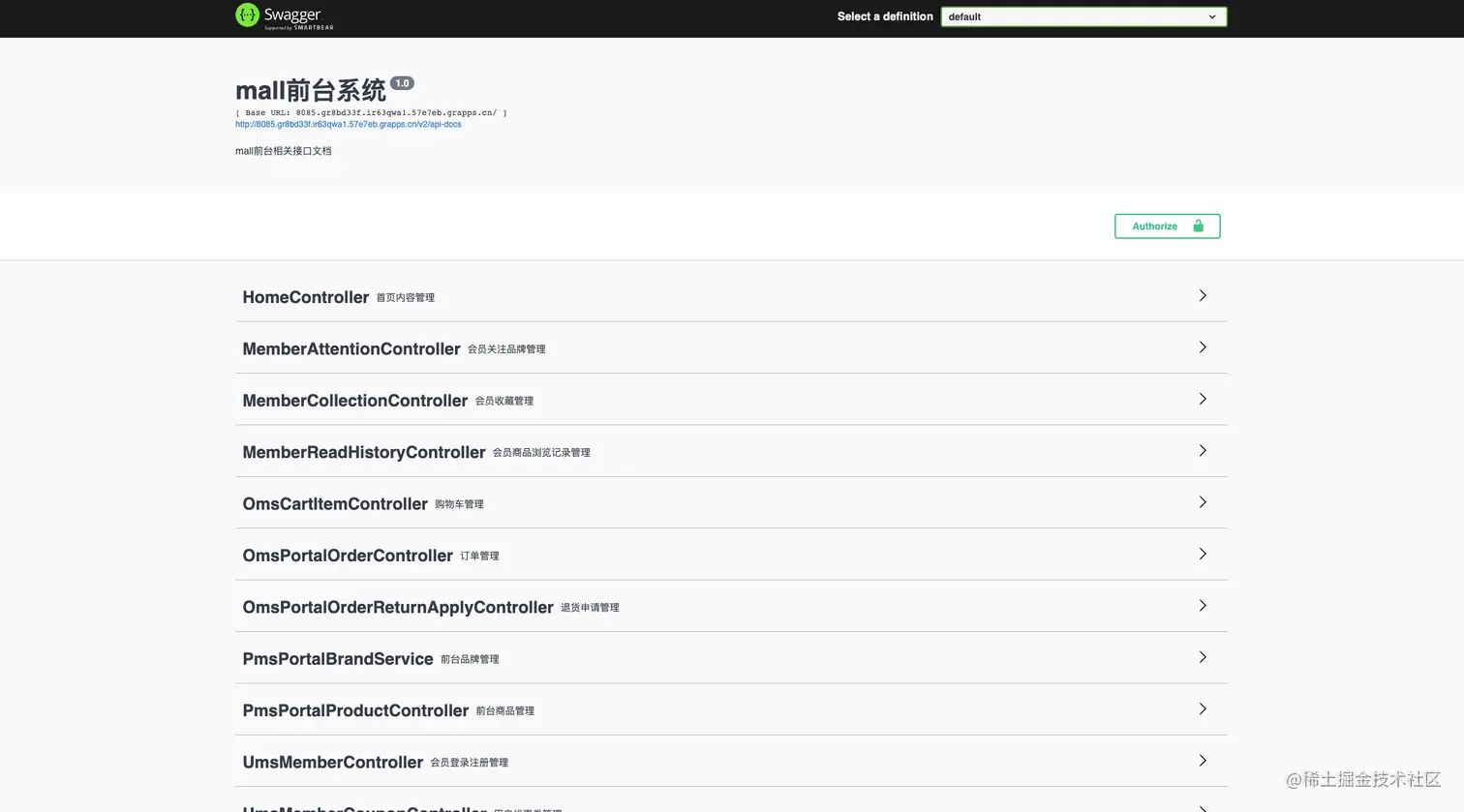 mall-portal 和 mall-search 暂时没有前端,可以访问后端 swagger 验证部署 http://xxx/swagger-ui/,如下: