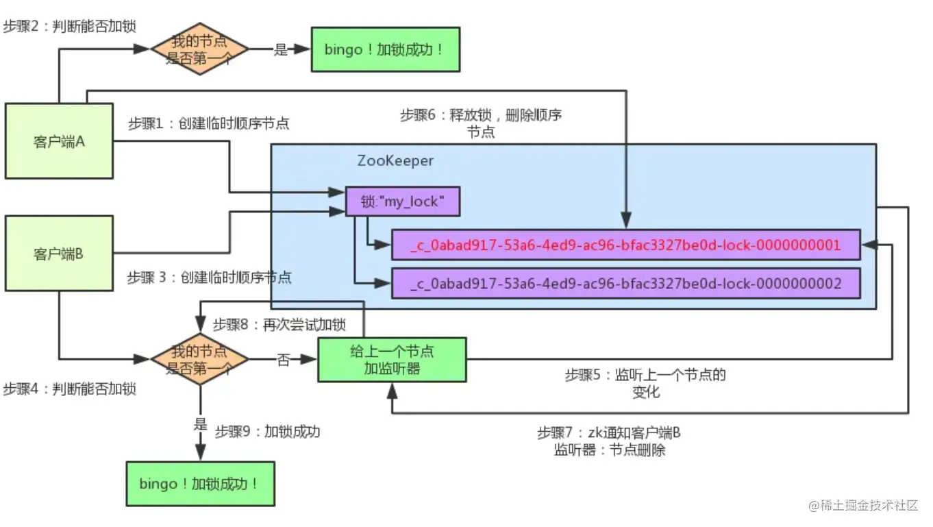 (5)线程A处理完,删除自己的节点,线程B监听到变更事件,判断自己是不是最小的节点,如果是则获得锁。