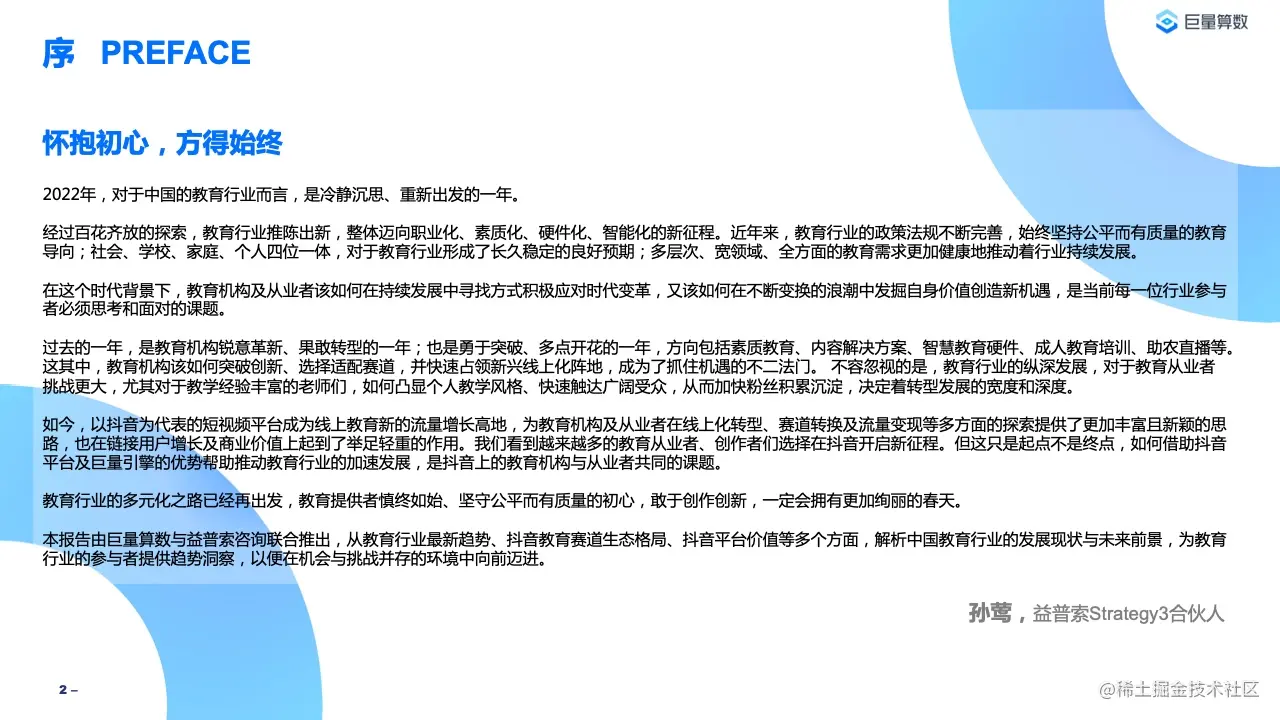 巨量算数x益普索联合发布2022教育行业研究报告《“拥抱变化,立足未来”——大教育新增长引擎》,从教育行业最新趋势、抖音教育赛道生态格局、抖音平台价值等多个方面,解析中国教育行业的发展现状与未来前景,为教育行业的参与者提供趋势洞察,以便在机会与挑战并存的环境中向前迈进。