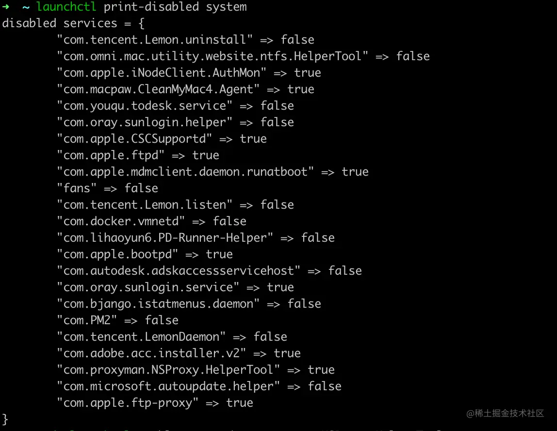 launchctl print-disabled system # 查看已禁用的系统服务 为true表示已被禁用
