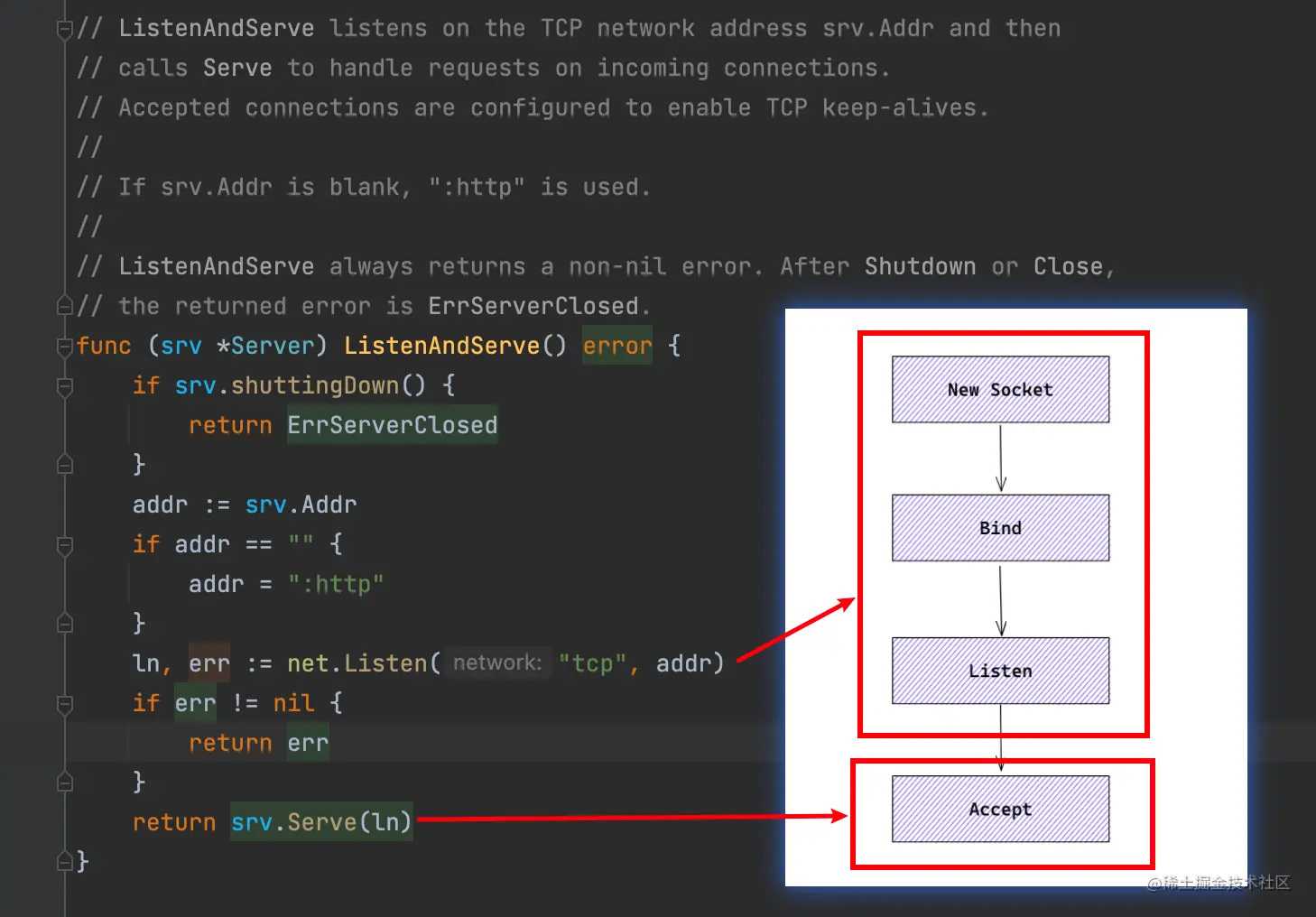 把分支代码收起来,只看主干,发现是一个 for 循环里面在不停地 Accept,而这个 Accept 在没有连接时是阻塞的,当有连接时,起一个新的协程来处理。