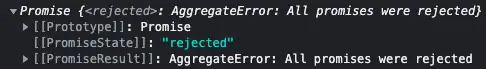 如果所有传入的 promises 都失败,Promise.any 将返回异步失败,和一个 AggregateError 对象,它继承自 Error,有一个 errors 属性,属性值是由所有失败值填充的数组。